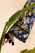 Delicate black lace cascades from the shoulders to the hems, artfully framing the sleeves, border, and pants with an understated elegance. A bold fusion of contrast and intricate florals, this set is the ultimate statement in modern sophistication with a touch of romance.