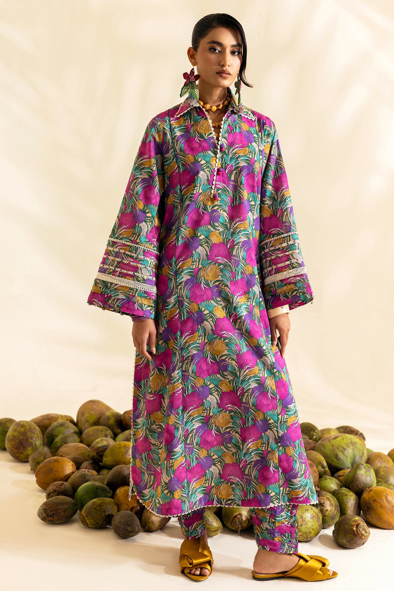 Swaya – A sun-kissed ode to summer, this vibrant co-ord set bursts with life in full bloom. Vivid fuchsia blossoms and lush emerald foliage sprawl across the fabric, creating a breezy, tropical allure where the florals take center stage in effortless harmony.
