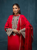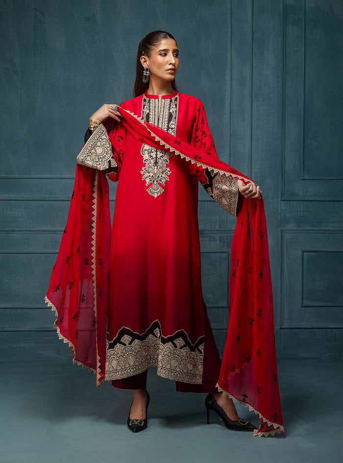 Nyra is a captivating three-piece ensemble crafted from luxurious raw silk. This stunning outfit features a dramatic ombré transition from a vibrant, fiery red to a deep, rich maroon, creating a breathtaking visual flow that mirrors a sunset. The shirt is exquisitely adorned with intricate black embroidery, featuring a grand, ornate neckline that flows into delicate scattered motifs on the body. The wide, gracefully flared sleeves boast prominent embroidered borders, echoing the elaborate patterns along the shirt's hem. Completing this powerful look is a flowing chiffon dupatta, subtly embellished with scattered black embroidered motifs.
