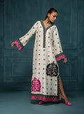 Azalea is a masterpiece of graceful design. The fluid raw silk kaftan features a rich ivory hue, punctuated by a scattering of miniature black embroidered motifs that dance across the fabric. The elegant embroidered V-neck frames the face beautifully, while the wide sleeves are finished with a sophisticated black and pink border. A show stopping hot pink motif blooms at the front hem, with two more adorning the back, creating a look that is both dramatic and effortlessly chic.