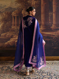 This stunning ensemble, featuring a straight-cut kurta crafted from rich Cobalt Blue velvet. The kurta is delicately adorned with beautiful pink and lilac thread-work embroidery, featuring intricate floral motifs that gracefully climb the side panels and frame the cuffs. This luxurious outfit is perfectly paired with raw silk trousers, which showcase coordinating embroidery along the hemline to complete the tailored look. The set is finished with a sophisticated sheer blue dupatta, elegantly bordered with a contrasting pink edge and subtle embroidered details.