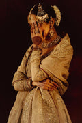 Gul-Bahar is specifically designed for those who don’t want to ditch pastels even on their big day. The dress features an enchanting beige peshwaz beautified by intricate embroidery on both the front and the back. The peshwaz, embellished with zardozi, crystals, and gota, is paired with an elegant red silk lehenga. This mesmerizing look is beautifully tied together by a beige organza dupatta featuring heavily embroidered borders highlighted with zardozi and sequins. This overall attire will give you a timeless look and help you leave a lasting impression on your audience.