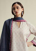 A sand ivory shirt enhanced with intricate plum embroidery, paired with a printed trouser and a blue dupatta that brings a cool, contemporary edge. Digital Printed Silk Dupatta 2.5 Mtrs Digital Printed Slub Cotton Shirt 3 Mtrs Digital Printed Cambric Trouser 2.4 Mtrs.