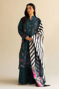 A teal set with a floral scatter, styled with a striped silk dupatta.
