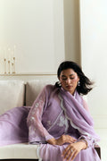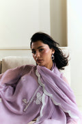•Shirt:Crafted in a light lilac hue, the shirt features ivory embroidery that stands out with delicate precision against the summery base. Hand embellishment along the neckline brings a subtle vibrancy, anchoring the design in both tradition and artistry.