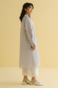 This long kurta in a soft lavender hue is tailored in breathable lawn, featuring intricate embroidery all over and finished with cuffed sleeves and delicate button detailing.