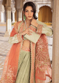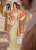 SABAZKARIYA — a fresh whisper of nature in sage green. Intricately embroidered rawsilk forms the foundation of this ensemble, where quiet craftsmanship meets elevated design. The soft fall of the dupatta adds fluid movement, creating a look that breathes grace into every step — serene, earthy, and effortlessly refined.