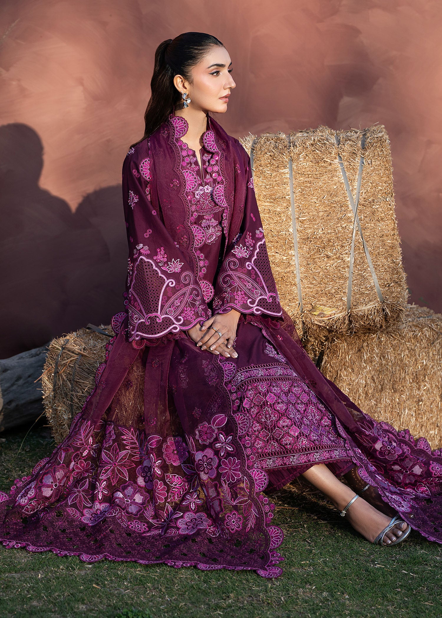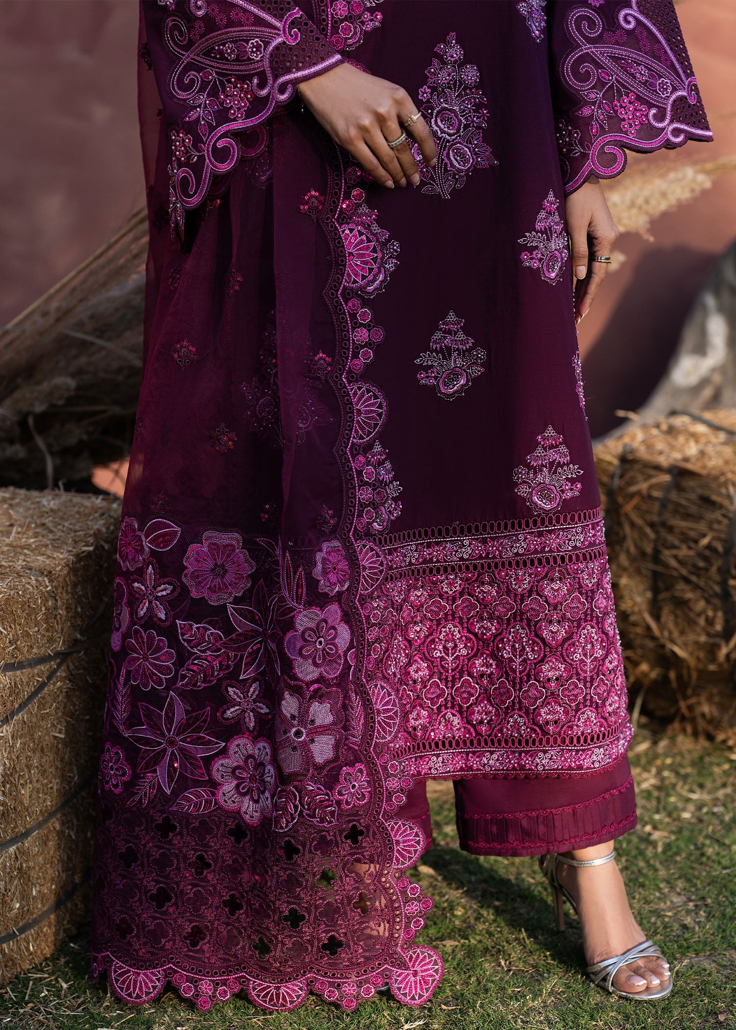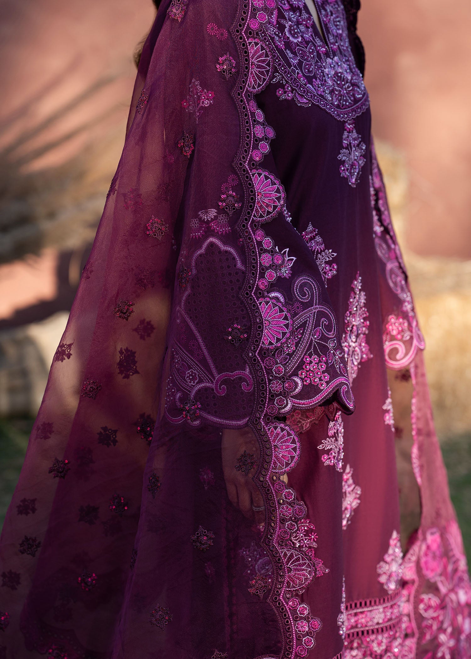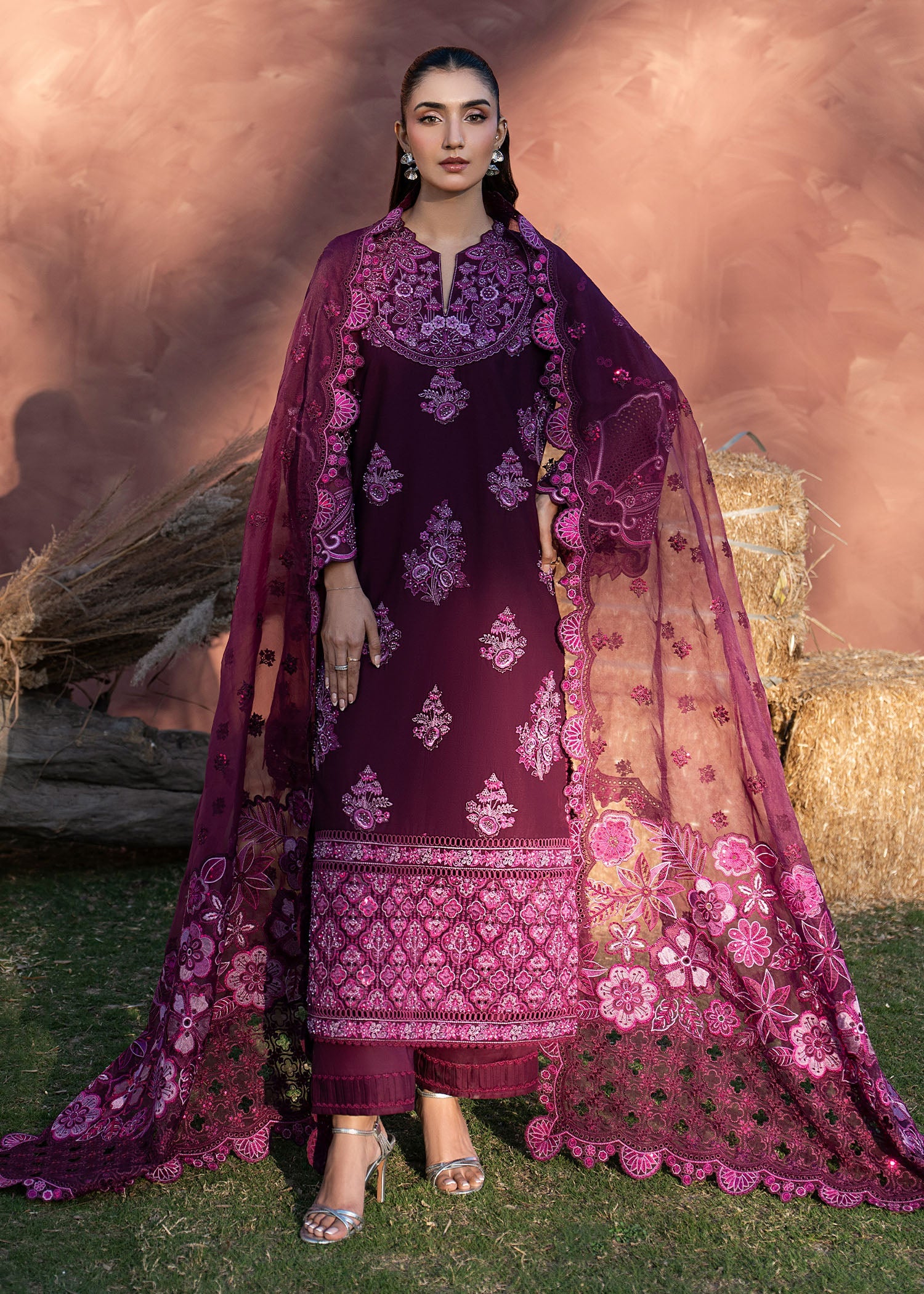 Step into burgundy luxury with BERRY. Featuring intricate embroidery on the shirt, neckline, and organza sleeves, complemented by an embroidered organza dupatta and classic lawn trousers, perfect for sophisticated celebrations. A look designed to make every festive moment feel rich, elegant, and unforgettable.