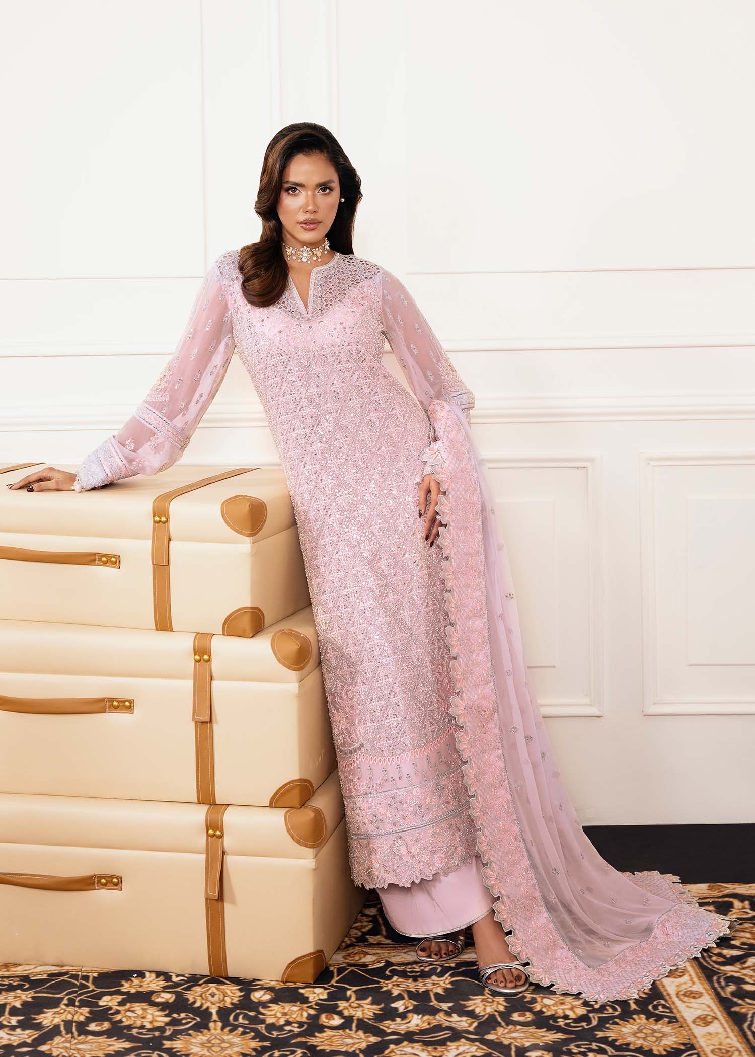 Celebrate festive elegance with PRISM in vibrant pink — a wedding-ready ensemble crafted in luxurious chiffon and raw silk. The embroidered shirt and sleeves, paired with raw silk trousers and a delicately detailed dupatta, create a look that radiates charm, sophistication, and timeless festivity.