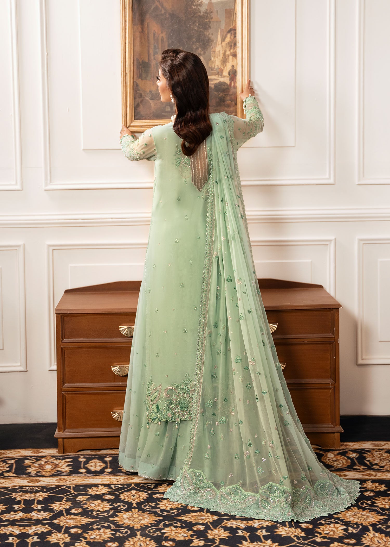 Presenting REGALIA in a stunning shade of green. A masterpiece of intricate embroidery on chiffon. From the delicately adorned shirt front, neck, and sleeves to the embroidered trousers and flowing dupatta, every detail exudes elegance and timeless sophistication. Step into a world where craftsmanship meets grace