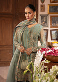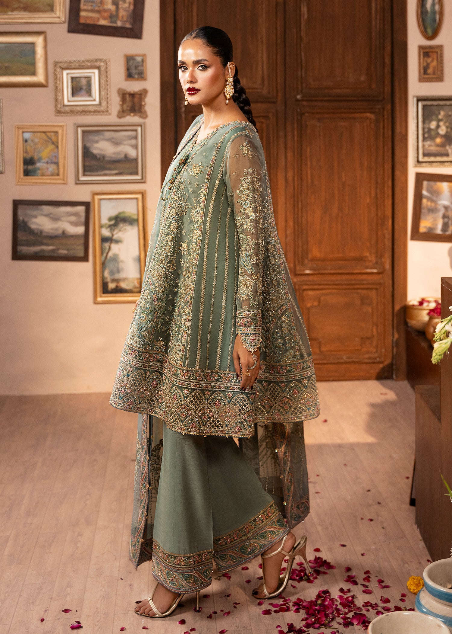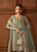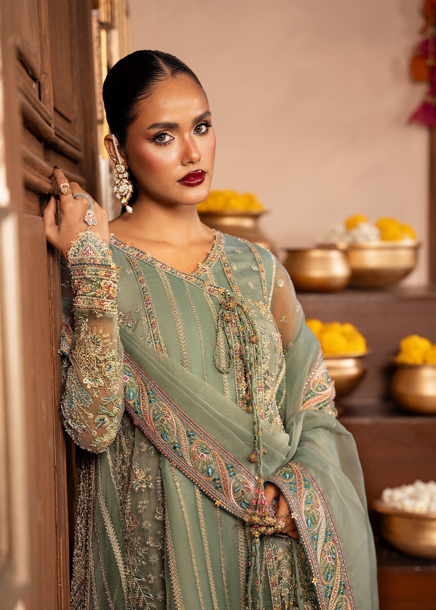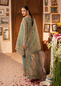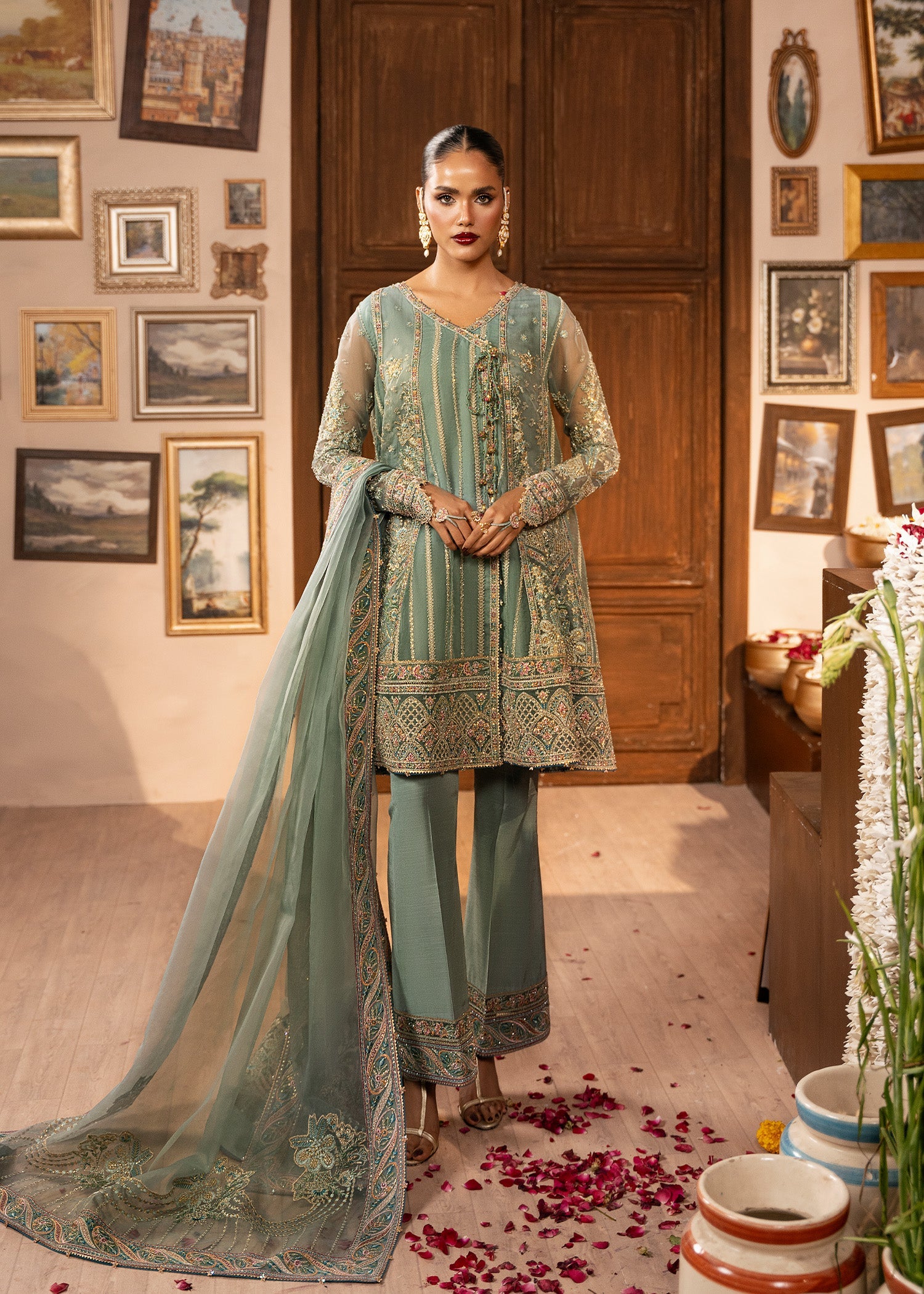 KIRSI, a cyan angrakha brought to life with intricate embroidery on organza panels and sleeves, paired with embroidered raw silk trousers and a organza dupatta — finished with embroidered hand extensions for a regal touch.