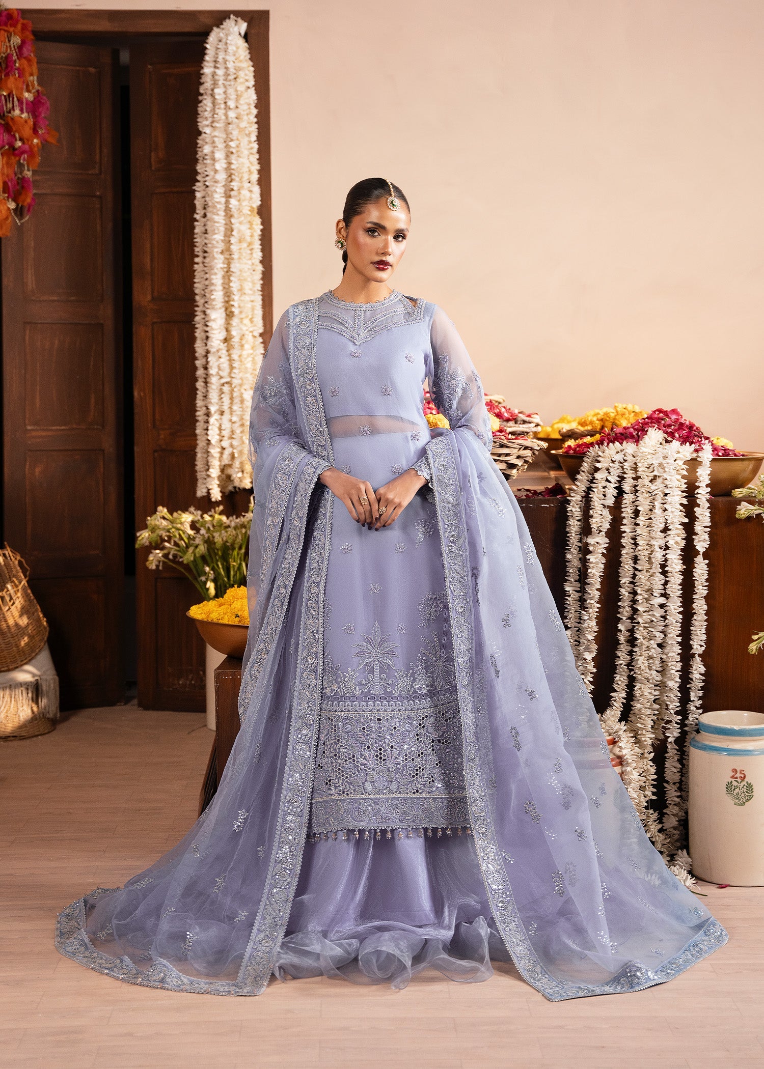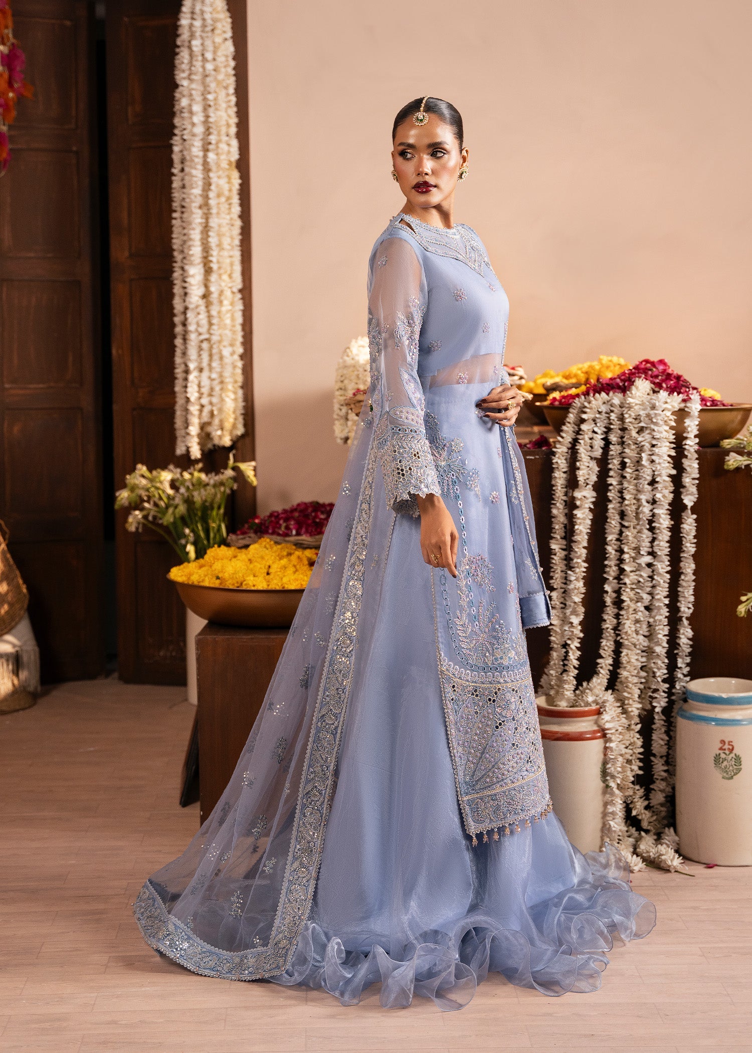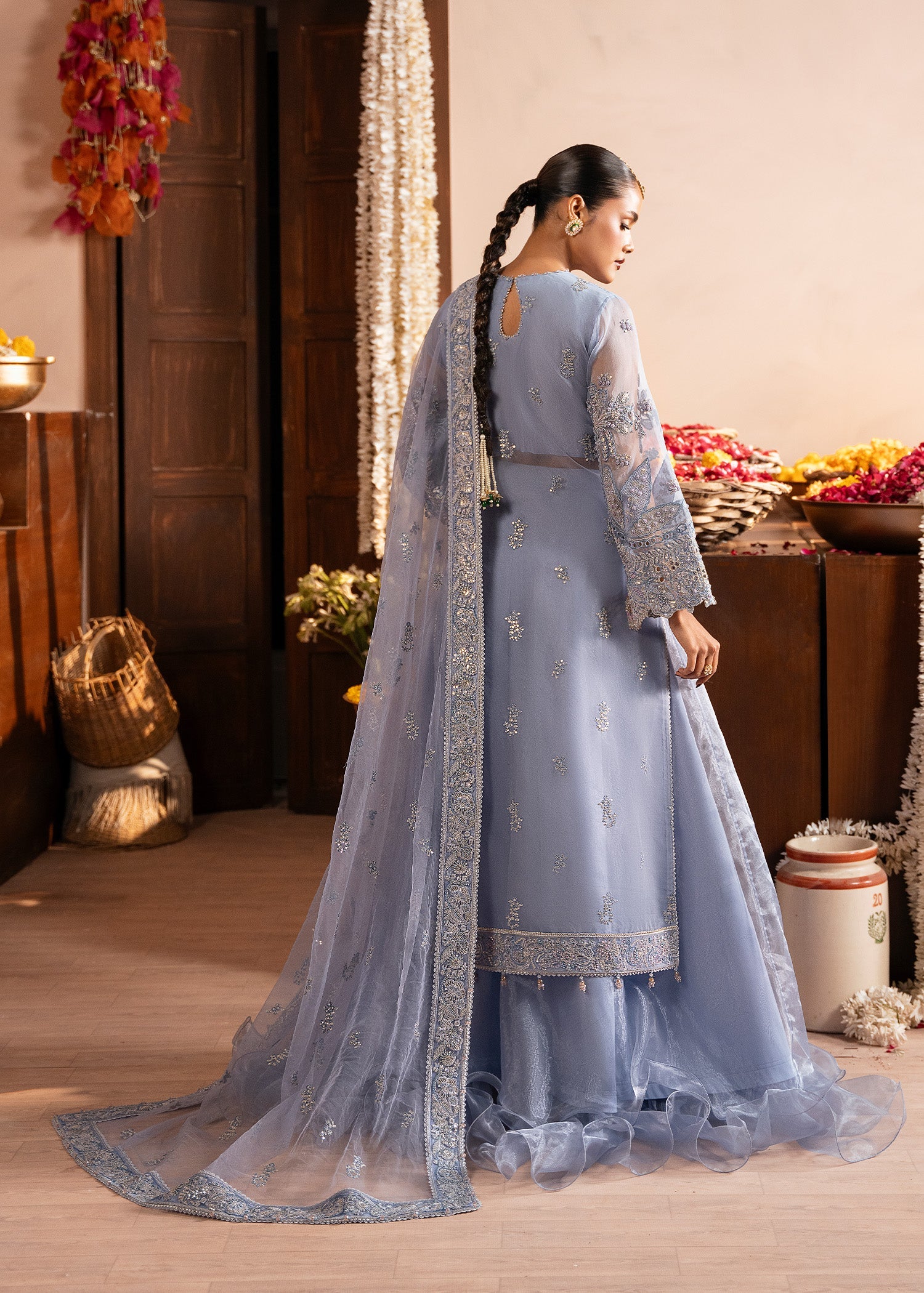 Meet ROOHI, a wedding festive dream in Blue Berry, where delicate organza embroidery meets effortless grace. The embroidered organza shirt and statement neckline are paired with fluid tissue trousers, finished with a finely embroidered net dupatta. Designed for moments that feel magical and memories that last forever.