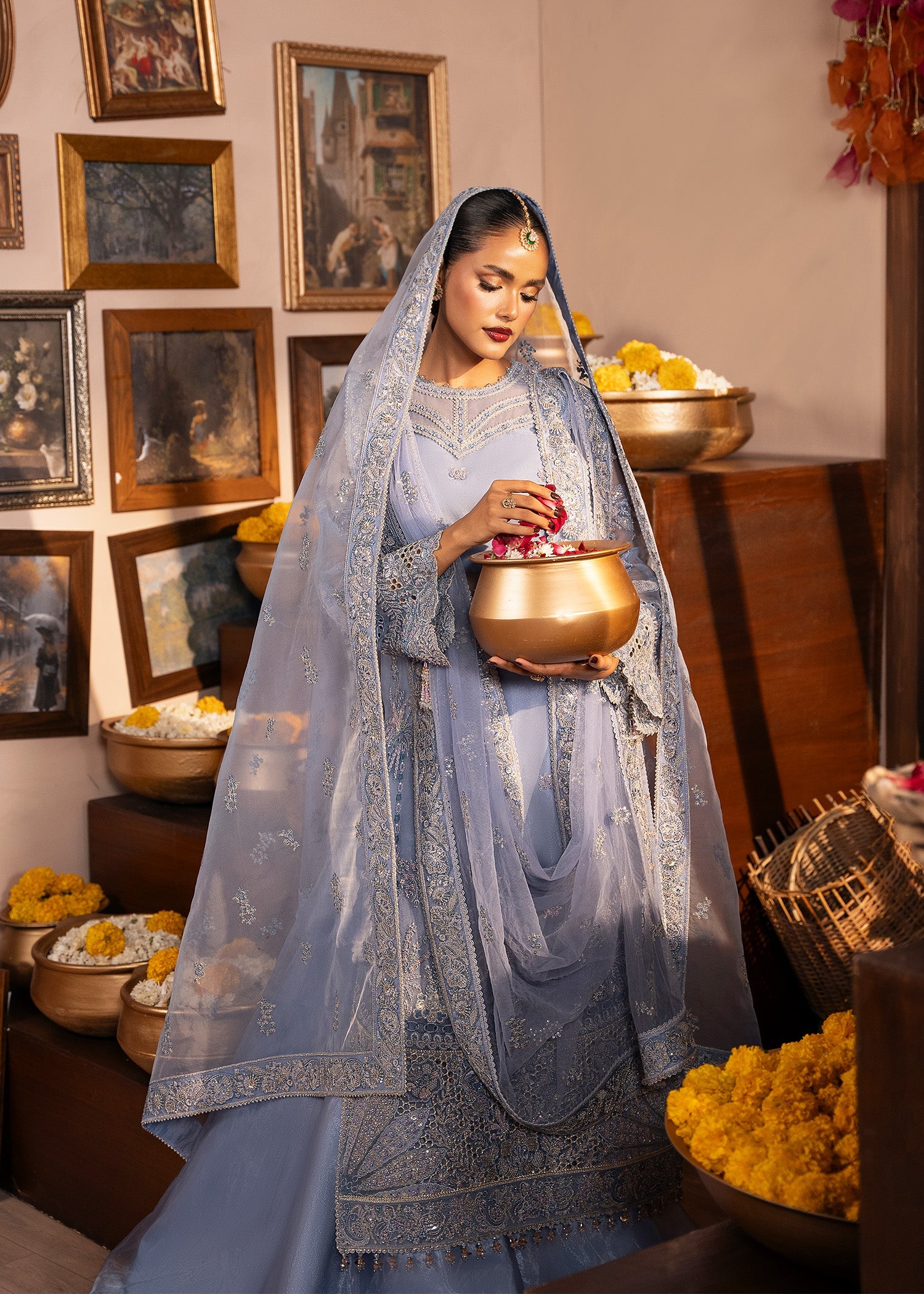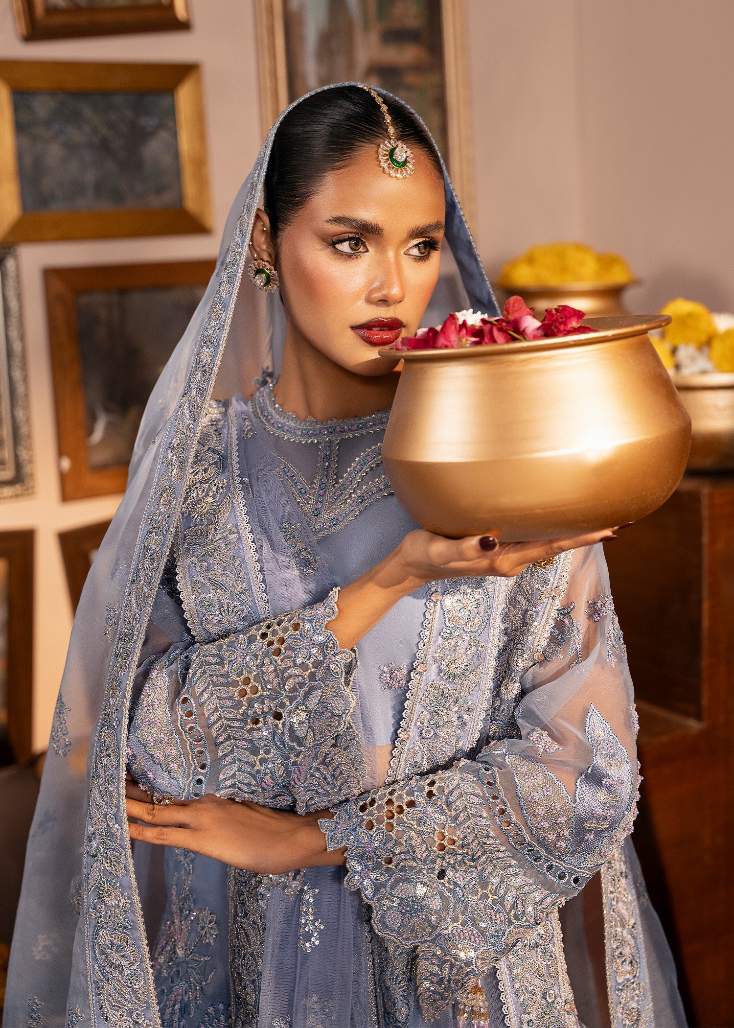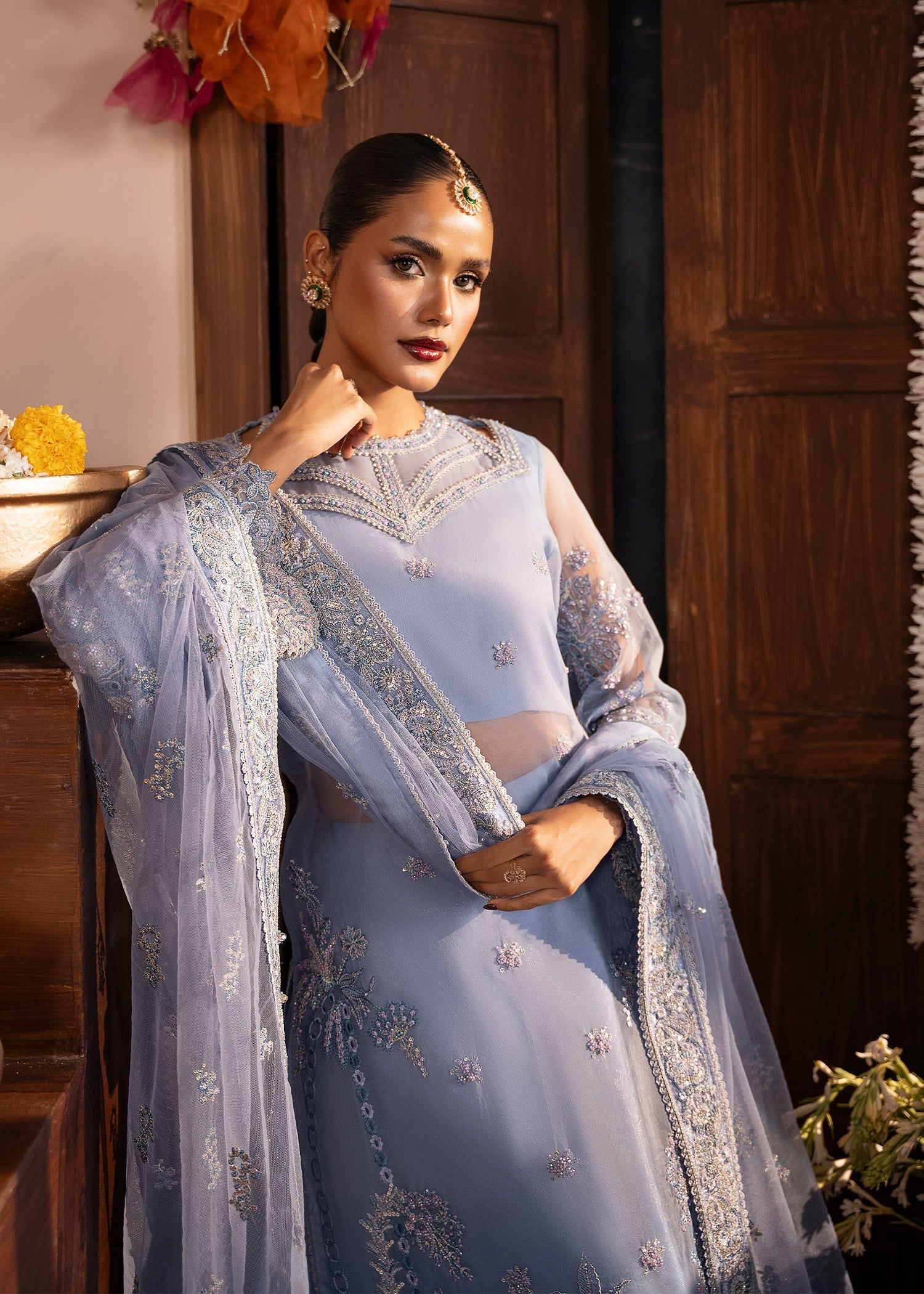 Meet ROOHI, a wedding festive dream in Blue Berry, where delicate organza embroidery meets effortless grace. The embroidered organza shirt and statement neckline are paired with fluid tissue trousers, finished with a finely embroidered net dupatta. Designed for moments that feel magical and memories that last forever.