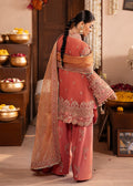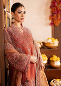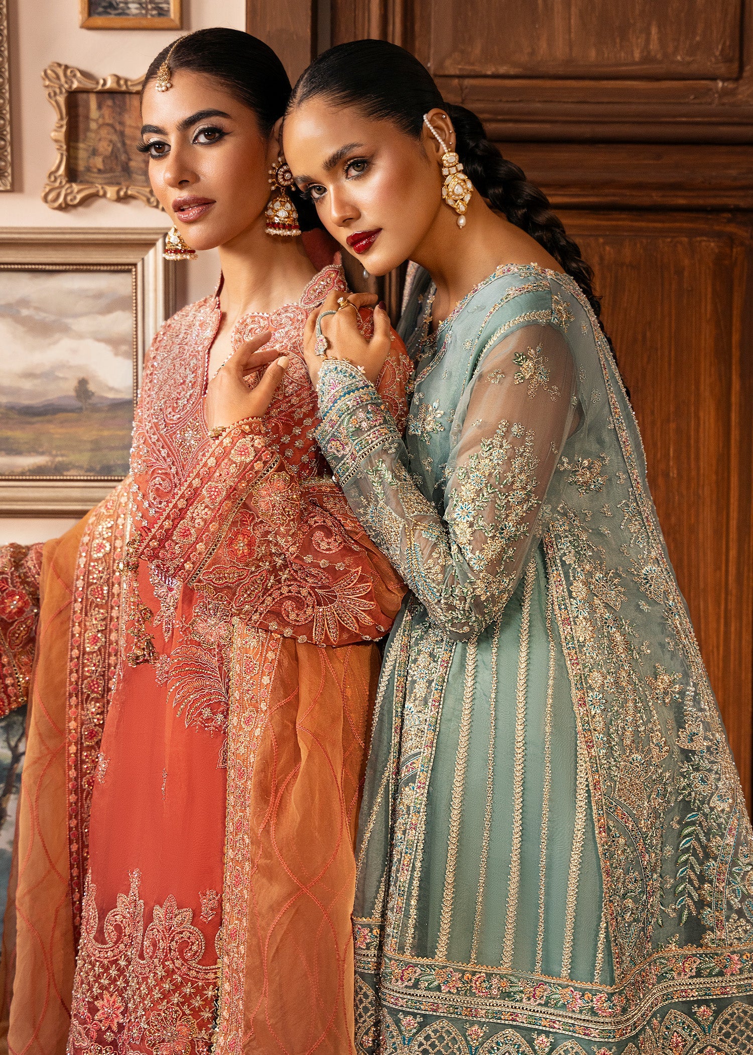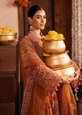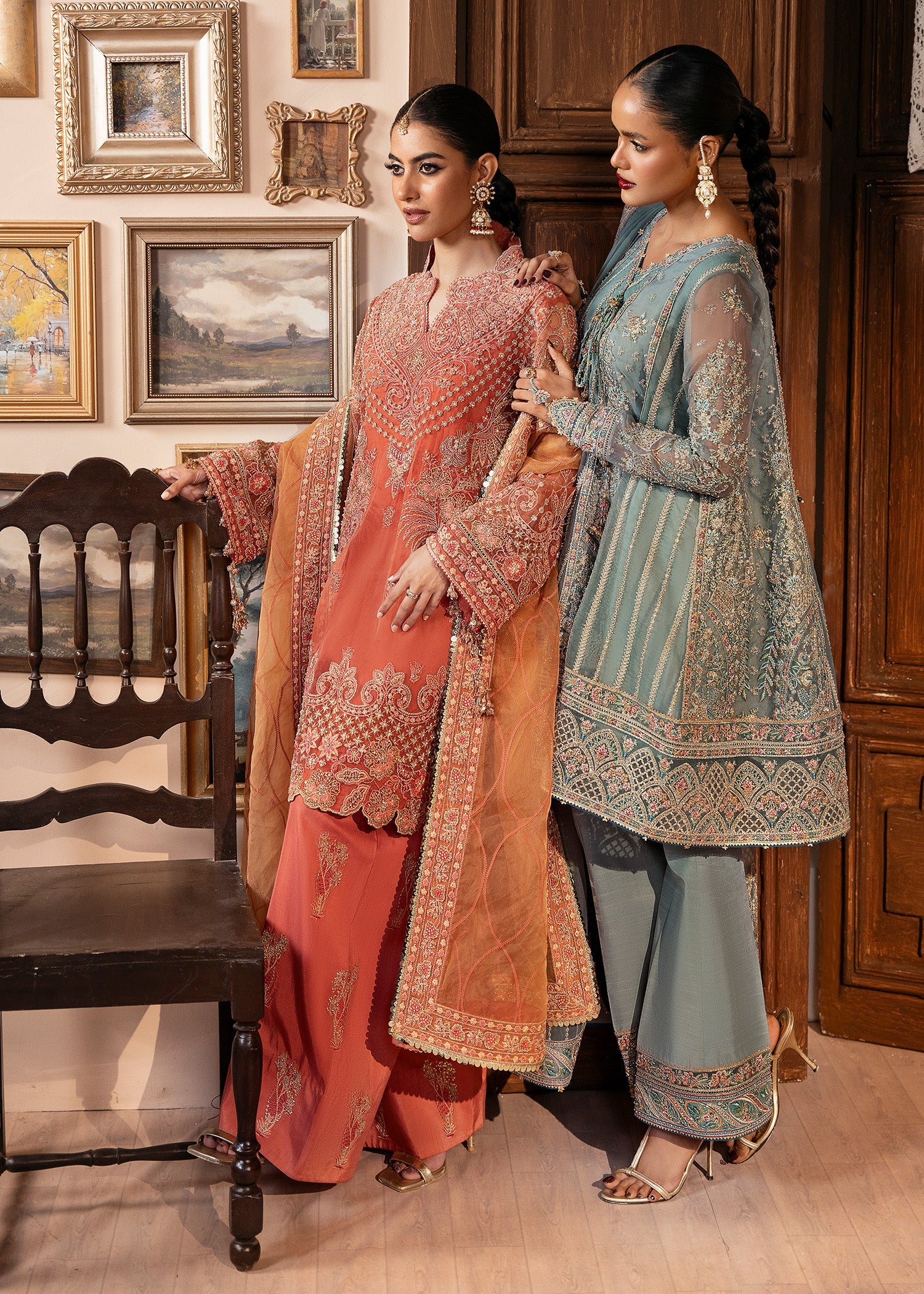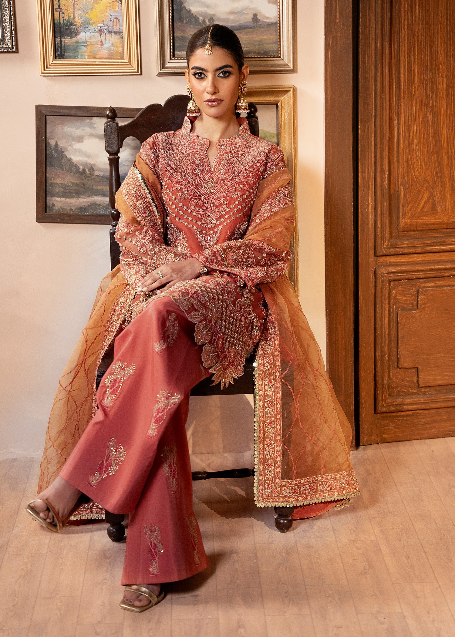 Presenting TARANNUM, a radiant expression of festive elegance in vibrant orange. The embroidered organza shirt, adorned with intricately embroidered sleeves, is beautifully detailed and paired with an embroidered raw silk trouser, finished with a graceful organza dupatta. A melody of craftsmanship, made for celebrations that shine.