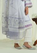 A graceful expression of tradition and modernity, this lilac self-textured lawn kurta is artfully layered with classic block prints that evoke timeless charm. The silhouette is elevated with delicate mirror work and traditional phulkari embroidery, creating a harmonious blend of texture and embellishment. Paired with crisp white cotton azzar pants, detailed with lace inserts and fine pleat accents, the ensemble is grounded in elegance and subtle craftsmanship. Completing the look is a self cotton net dupatta, adorned with coordinating block print motifs and finished with intricate lace edging—bringing together heritage techniques in a refreshingly contemporary form.