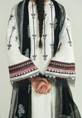 Timeless elegance meets artisanal finesse in this ivory white self-tarkashi lawn kurta, beautifully adorned with traditional black block printing that lends a striking yet refined contrast. The neckline features intricate embroidery in black, ivory, and hints of maroon—delicately hand-finished with meticulous stitching that adds depth and character. The sleeves and hemline are accentuated with sheer organza and fine pleat detailing, enhancing the silhouette with graceful texture. Paired with classic ivory trousers and a contrasting black chiffon dupatta featuring bold block prints, this ensemble captures the essence of heritage craftsmanship in a modern, minimalist palette.