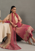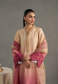 This opulent masterpiece, enveloped in an exquisite salmon peach hue, redefines the essence of luxury. The shaded shirt, fashioned from the finest raw silk cascades with an ethereal elegance, adorned with resplendent gold threadwork, dazzling sequins, and intricate 3D rosettes, each meticulously crafted floral motif exemplifies unrivaled artisanal mastery, creating a tableau of timeless grandeur.The ensemble is further elevated by a meticulously tailored trouser, and an impeccably shaded draped organza dupatta, sprinkled with a lavishly intricate embroidered flowers. Designed for the most discerning clientele, this design exudes feminine charm and playful allure, making it the perfect choice for sophisticated daytime celebrations.