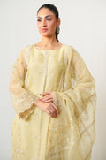Immerse yourself in understated elegance with the Soft Sands Oat color 3-piece embroidered suit. The sophisticated organza fabric features fine embroidery on panels, sleeves, and dupatta with ornate borders. Hand embellishments elevate the design for special occasions. Complete with a comfortable dyed slip and raw silk trouser, this formal wear ensemble offers timeless sophistication.
