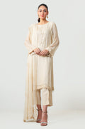 This Chiffon Charm dress in beige color offers a graceful blend of sophistication and style. Embroidered chiffon panels and Kali, paired with finely detailed borders, create a statement look. The lightweight dupatta adds an ethereal touch, while the hand embellishments enhance its elegance. Paired with classic raw silk trouser, this ensemble ensures a refined formal appearance.