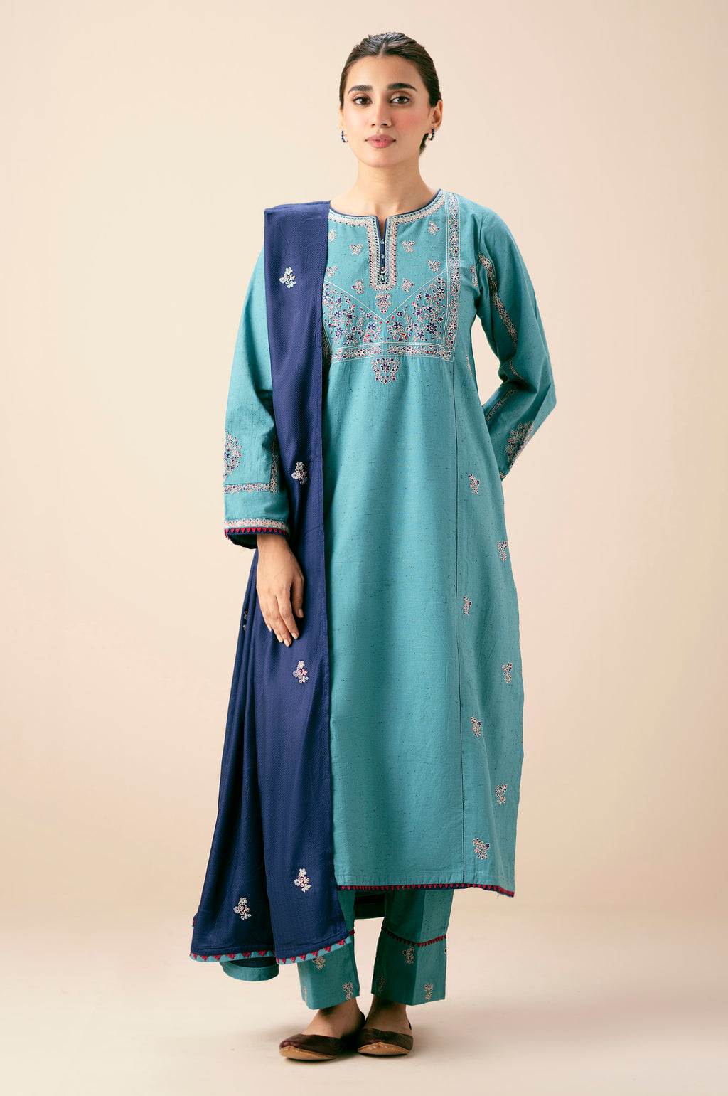 We are delighted to present Hoorain Designer Wear's premium sewing service, which is dedicated to delivering flawless sewing styles and exceptional quality. Our skilled team devotes careful attention to detail, ensuring that each dress is meticulously planned and sewn in accordance with the brand shoots showcased on our website. However, it is important to bear in mind that these shoots often incorporate design elements for illustrative purposes only, which may not necessarily be included in our dresses. Consequently, customers should expect minor variations.